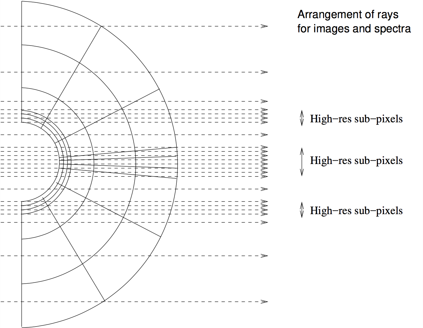 Fig. 23 When making an image, RADMC-3D will automatically make ‘sub-pixels’ to ensure that all structure of the model as projected on the sky of the observer are spatially resolved. Extreme grid refinement leads thus to extreme sub-pixeling. See Section Recursive sub-pixeling in spherical coordinates for details, and ways to prevent excessive sub-pixeling when this is not necessary.
